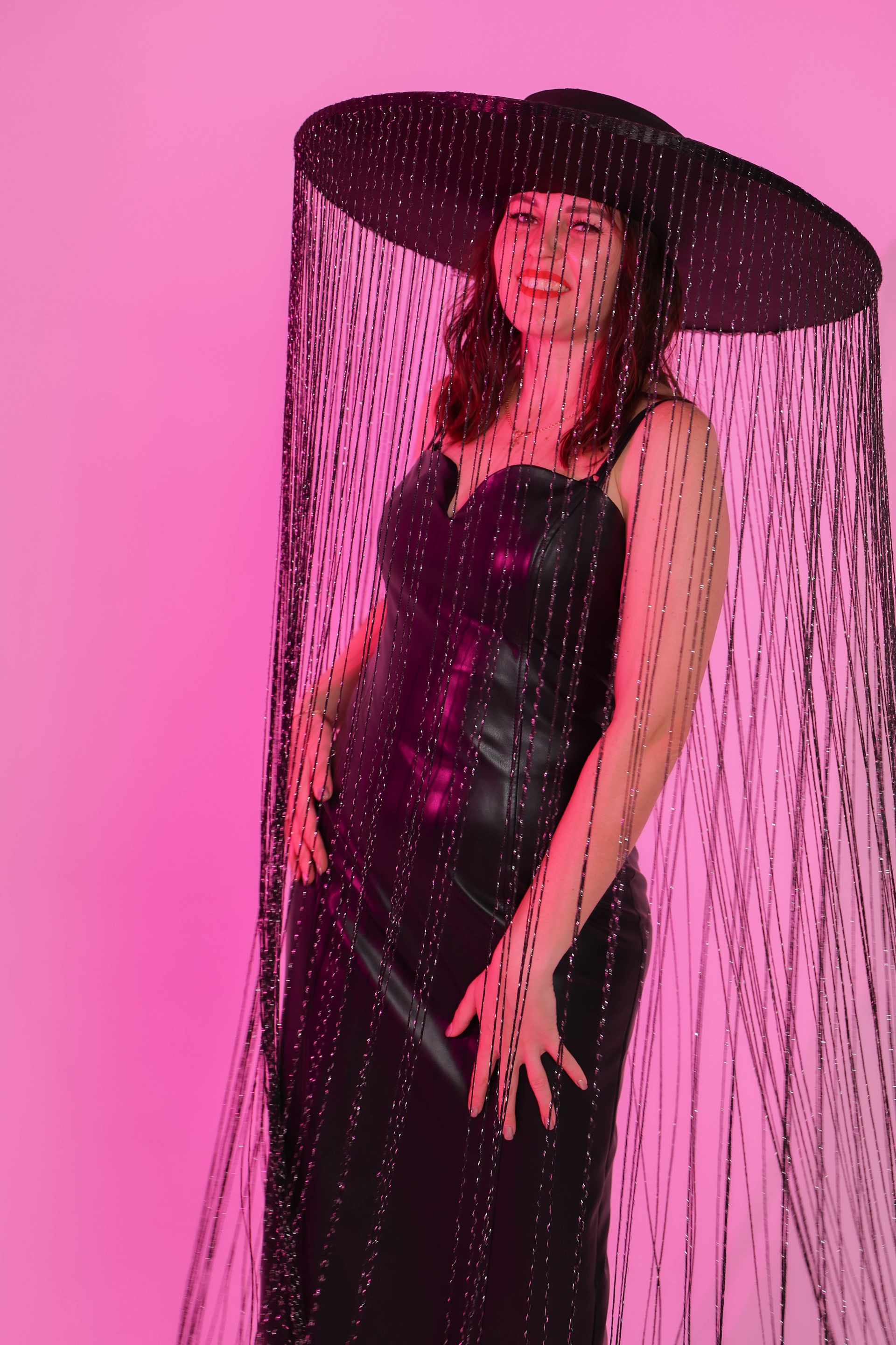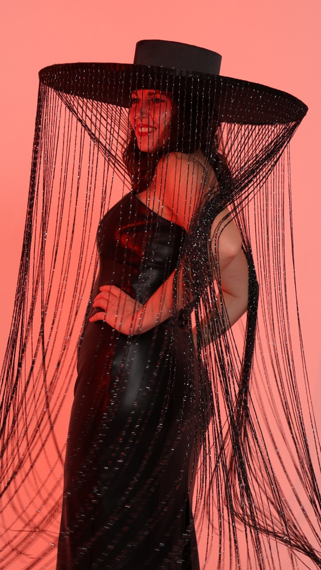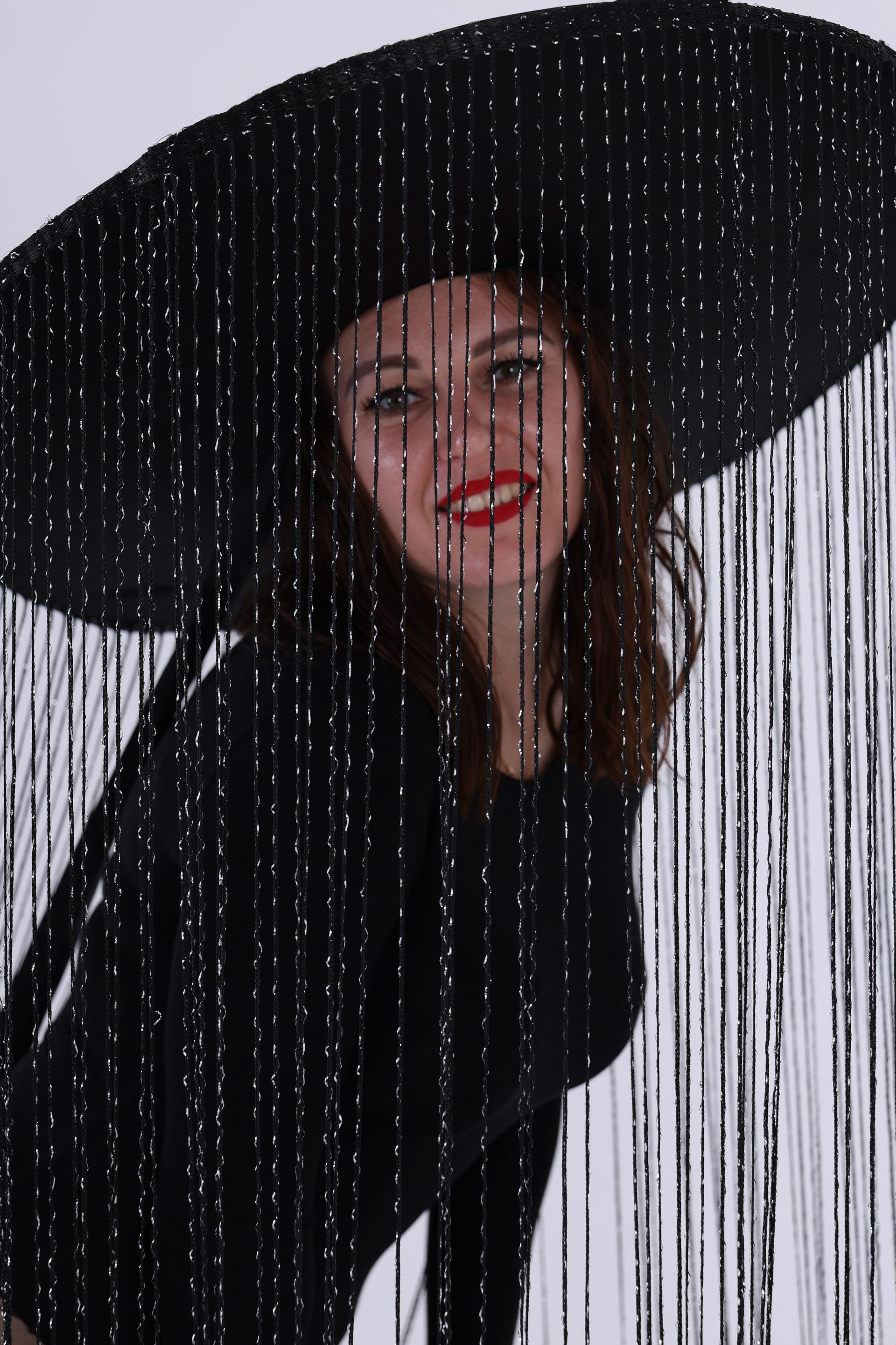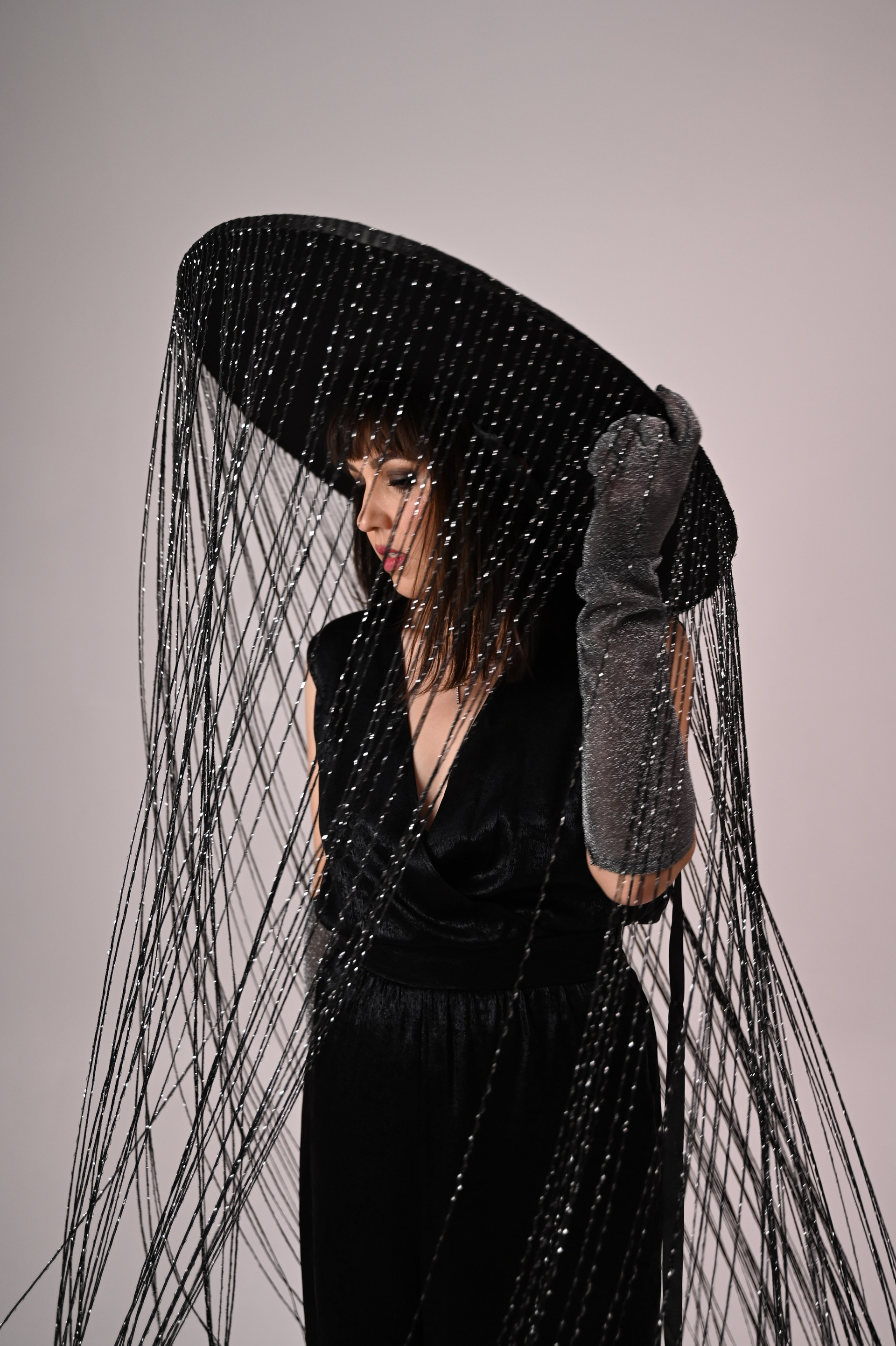 Окутанная дымкой загадочности... Шляпа с ниспадающими нитями мягко обрамляет лицо, создавая хрупкий и загадочный образ. В каждом движении — грация, в каждом кадре — эстетика.