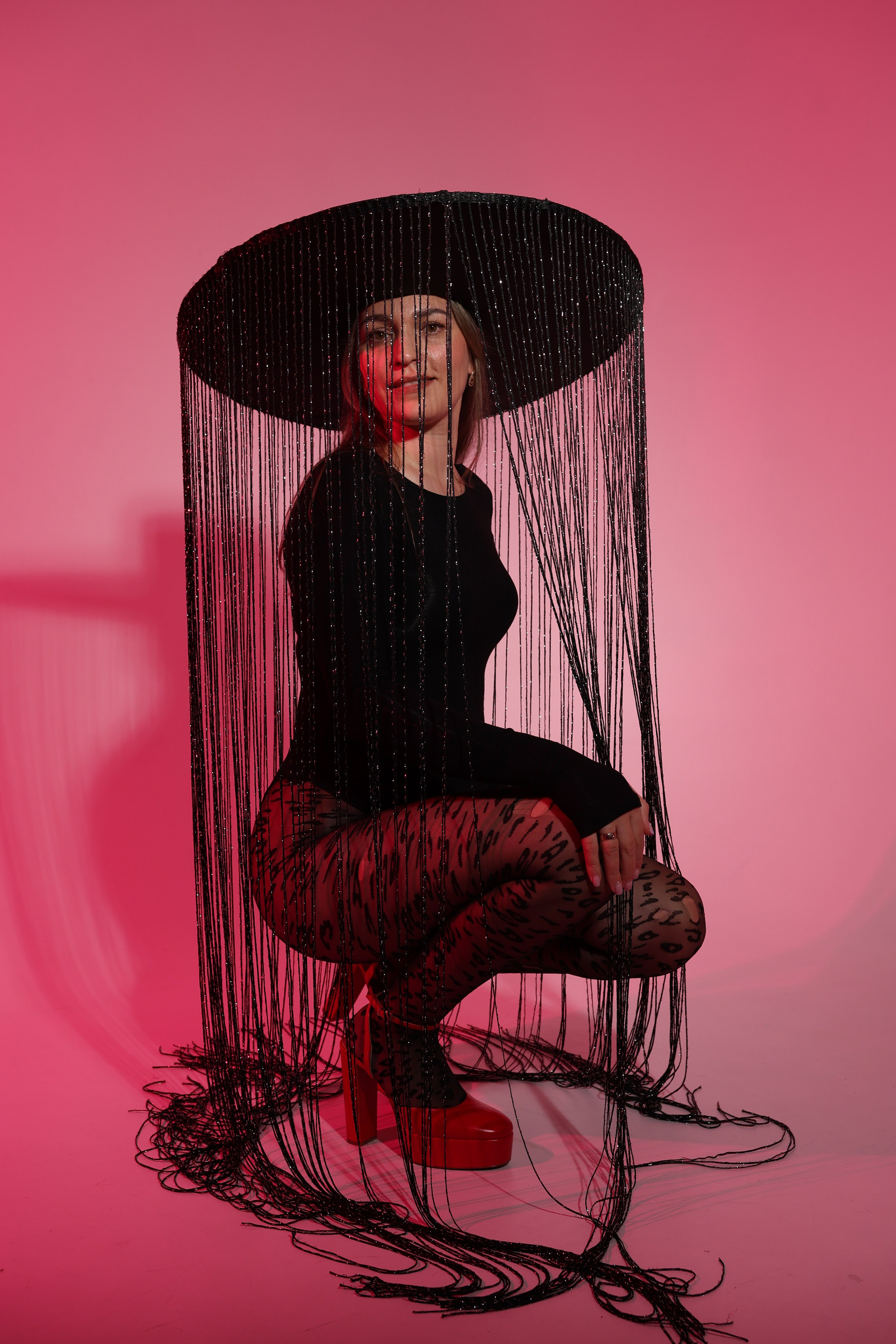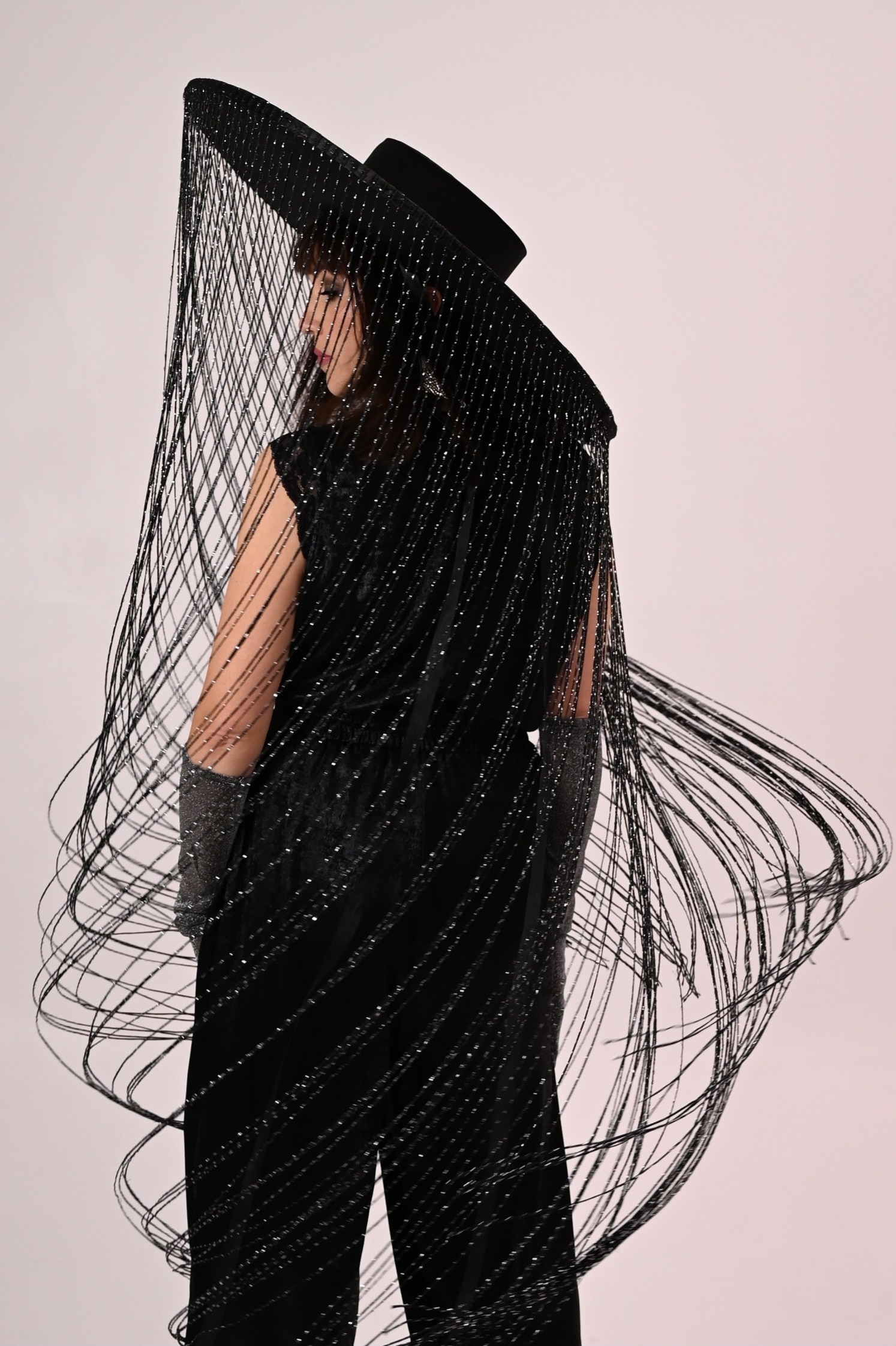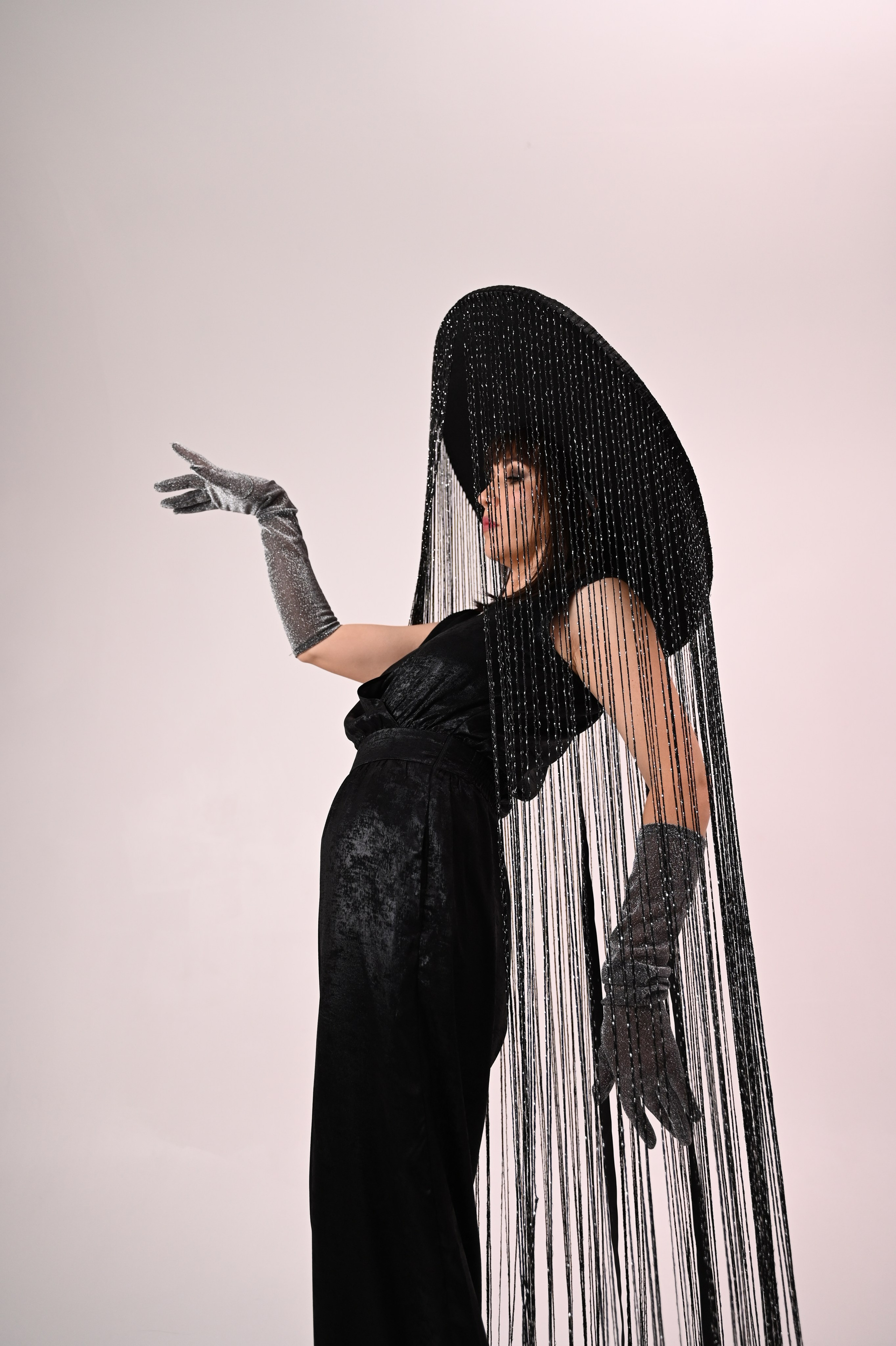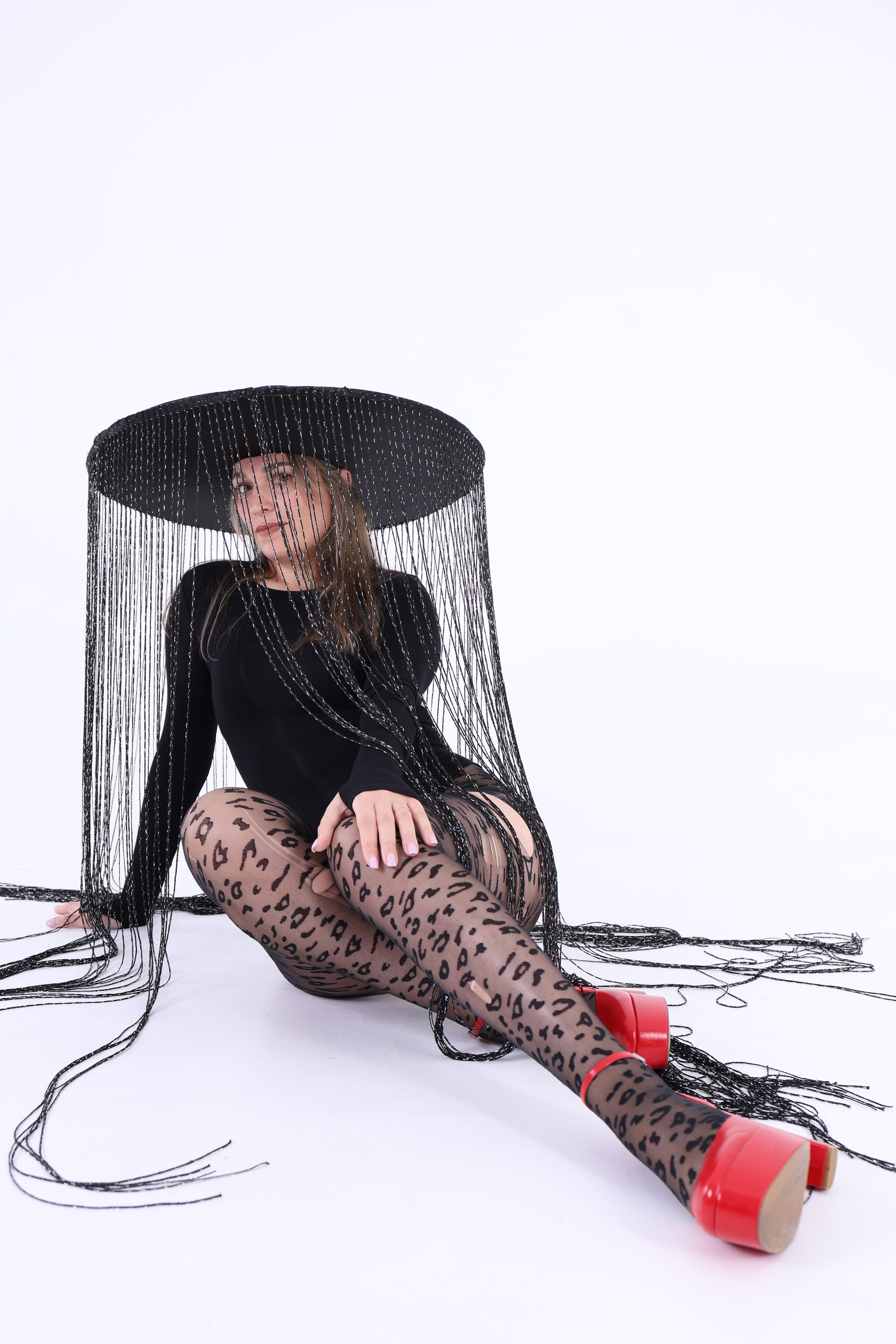 Окутанная дымкой загадочности... Шляпа с ниспадающими нитями мягко обрамляет лицо, создавая хрупкий и загадочный образ. В каждом движении — грация, в каждом кадре — эстетика.